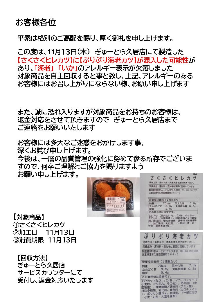 【自主回収、「えび」表示ミス】ぎゅーとらラブリー久居店「さくさくヒレカツ」と表示された「ぷりぷり海老カツ」2025年11月13日